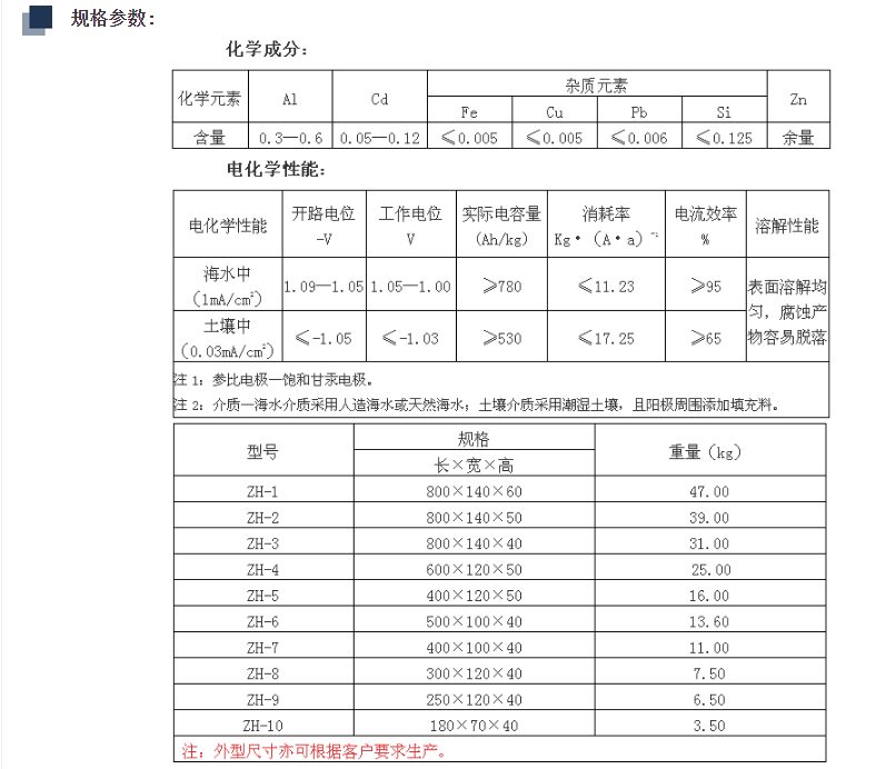 我公司生產(chǎn)的鋅合金犧牲陽(yáng)極采用優(yōu)良的原材料(鋅陽(yáng)極原料純度不低于90%)多重質(zhì)檢工藝(雜質(zhì)質(zhì)檢、金相顯微分析、全套化學(xué)分析),